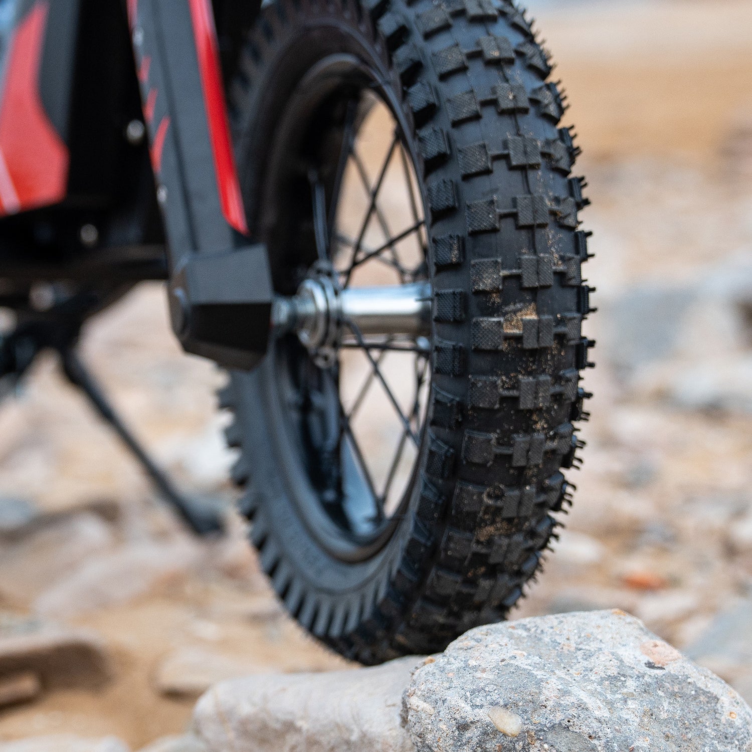 Featuring 12-inch rubber tires and an ergonomic anti-slip seat, this electric motorcycle delivers comfort, grip, and long-lasting fun.